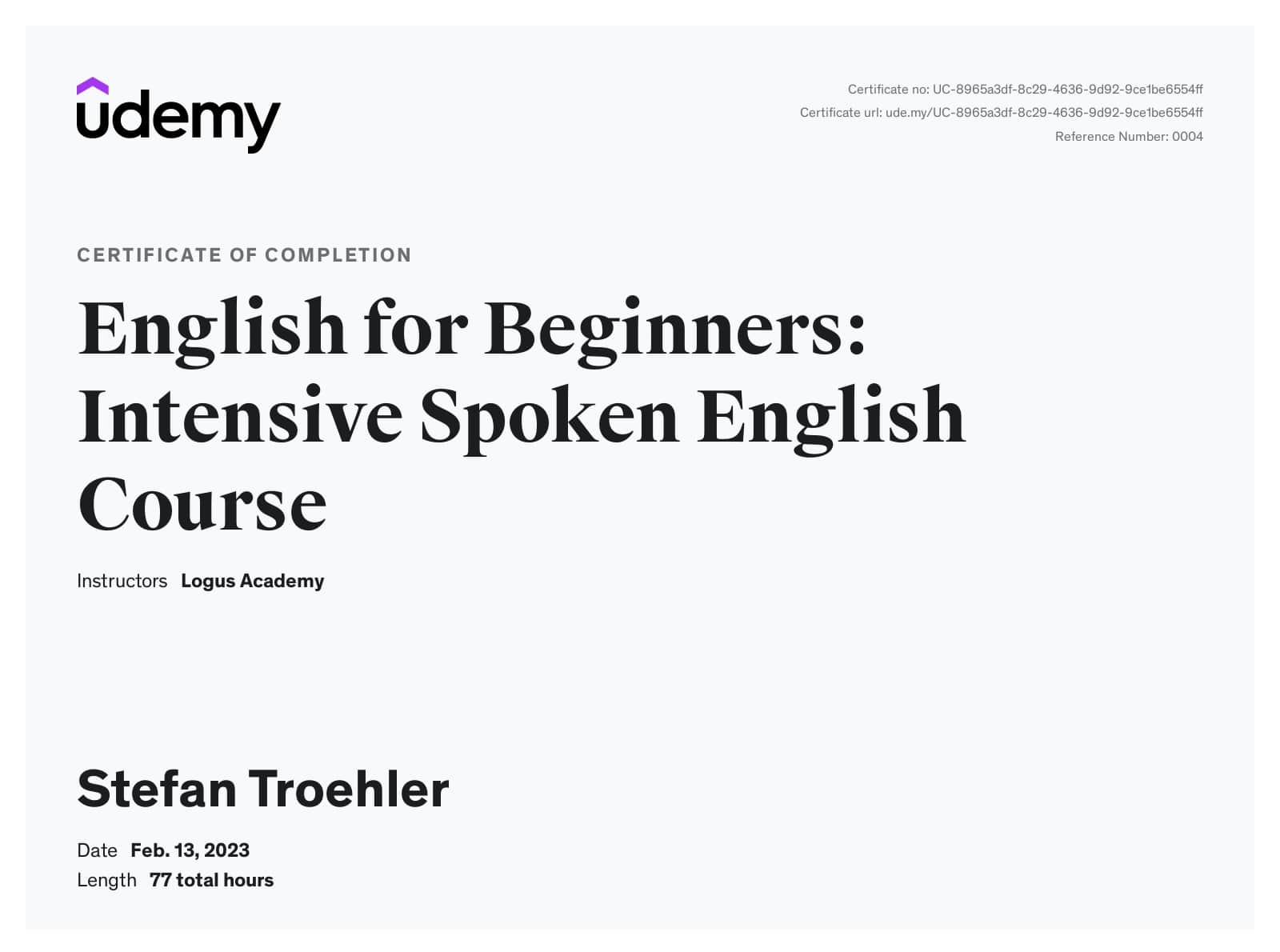 Ce certificat ci-dessus atteste que Stefan Troehler a suivi avec succès le cours d'anglais pour débutants : cours intensif d'anglais parlé le 13/02/2023 tel qu'enseigné par Logus Academy sur Udemy. Le certificat indique que l'ensemble du cours a été complété tel que validé par l'étudiant. La durée du cours représente le nombre total d'heures de vidéo du cours au moment de sa dernière réalisation.